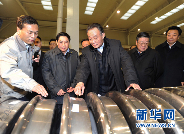 ????11月19日至23日,全國人大常委會委員長吳邦國在山西調(diào)研。這是11月20日,吳邦國在太原重工集團高速輪對國產(chǎn)化項目現(xiàn)場詳細了解工藝流程和技術指標。 新華社記者 李濤 攝