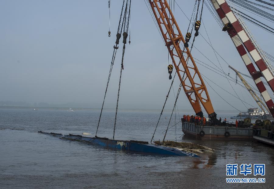 新華網湖北監利6月5日電(記者皮曙初、王賢)記者在“東方之星”沉船施救現場看到,7時40分,“東方之星”船體已側翻過來,露出“東方之星”四個大字,藍色的船體也已露出水面。