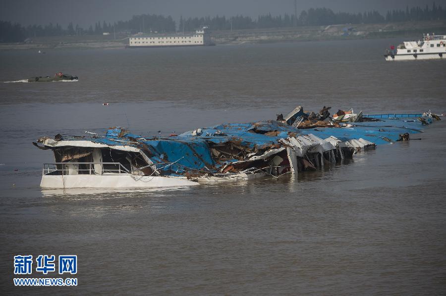 6月5日,救援人員正在進行整體扶正打撈工作。當日9時05分,長江“東方之星”完全扶正,但仍沉沒在水中,只露出藍色船頂。 新華社記者 肖藝九 攝