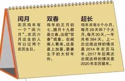 一些細心的網友發現,今年是農歷丁酉雞年,雞年有兩個立春日,出現“一年兩頭春”歷法現象。所謂“一年兩頭春”也稱“雙春年”,是指在農歷的一年中有兩個立春之日。具體到農歷雞年來說,2017年1月28日開始進入農歷雞年,而直到2018年的2月16日才會迎來下一個農歷新年,所以農歷丁酉雞年就包含了兩個立春日,即雞年的正月初七立春(2017年2月3日)和同年臘月十九(2018年2月4日)再次立春。