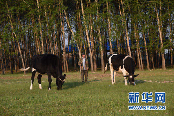 6月14日,黑龍江省龍江縣哈拉海鄉西里村貧困戶龍雙山趕著牛吃草。新華社記者 王建 攝