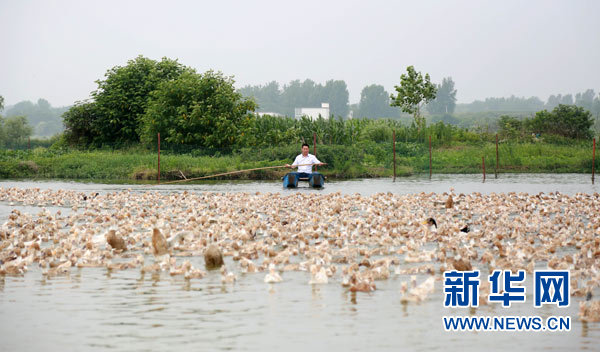 6月14日,在河南省信陽市光山縣文殊鄉杜槐村麻鴨養殖基地,甘平安正在放養麻鴨。新華社發