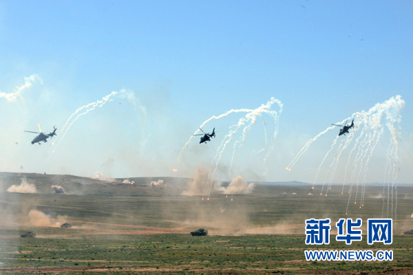 “和平使命-2014”聯合軍演中,原陸軍第38集團軍某紅軍團突擊分隊在陸航掩護下沖擊目標陣地 (2014年8月26日攝)。新華社發