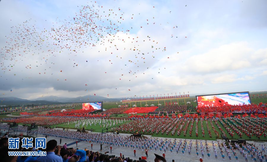 8月8日,內蒙古自治區成立70周年慶祝大會在呼和塔拉內蒙古少數民族群眾文化體育運動中心舉行。圖為群眾行進表演。新華網記者 陳杰 攝