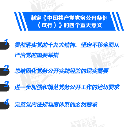 新華網北京12月25日電(記者 盧俊宇)近日,中共中央印發《中國共產黨黨務公開條例(試行)》(以下簡稱《條例》)。這標志著今后全黨黨務公開工作將有一部明確剛性的基礎主干黨內法規來加強和規范。