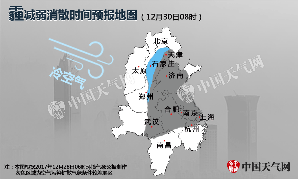 ??本次霾(2017年12月28日-30日)過程減弱消散預報圖。(稿件內圖片來源:新華社、中國天氣網、視覺中國)