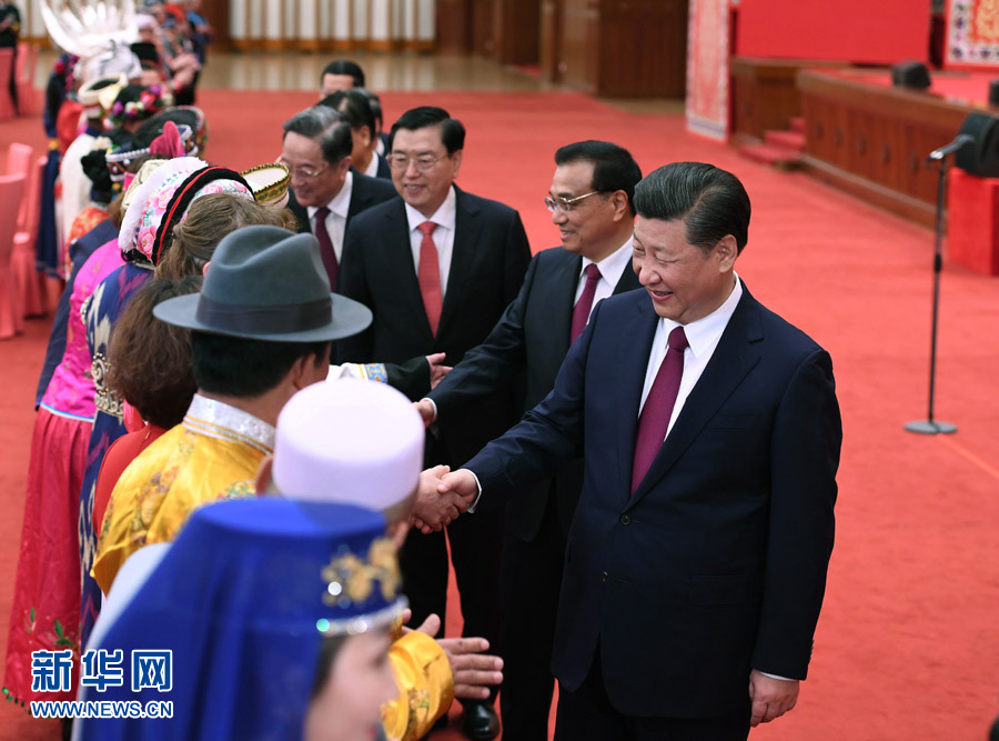 3月11日晚,中共中央統戰部、全國人大民族委員會、國家民族事務委員會、全國政協民族和宗教委員會在北京人民大會堂舉行茶話會,黨和國家領導人習近平、李克強、張德江、俞正聲、劉云山、王岐山、張高麗等與出席十二屆全國人大五次會議和全國政協十二屆五次會議的少數民族代表委員們歡聚一堂,共慶全國兩會勝利召開,共祝偉大祖國繁榮昌盛,共話中華民族美好未來。新華社記者 李學仁 攝