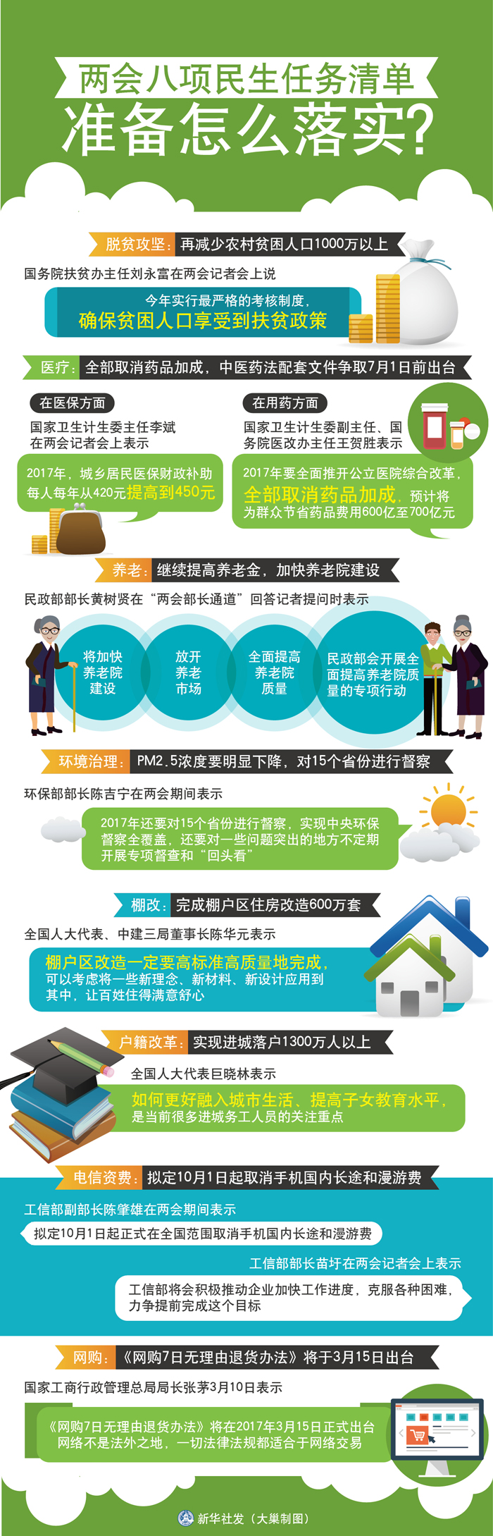 圖表:兩會八項民生任務清單準備怎么落實? 新華社發(fā) 大巢制圖