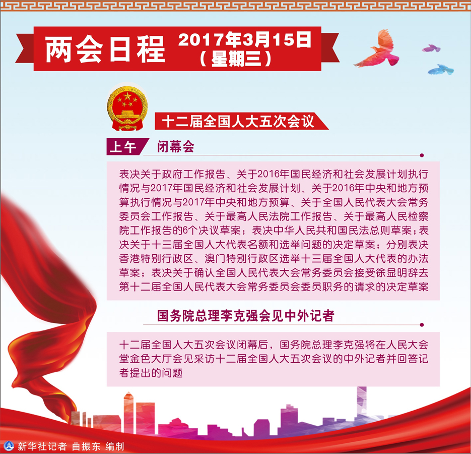 圖表:3月15日兩會日程 新華社記者 曲振東 編制