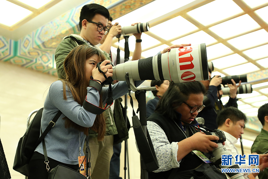 3月15日上午,國務院總理李克強在人民大會堂三樓金色大廳會見采訪十二屆全國人大五次會議的中外記者并回答記者提出的問題。圖為記者會現場的攝影記者。新華網/中國政府網 翟子赫 攝?