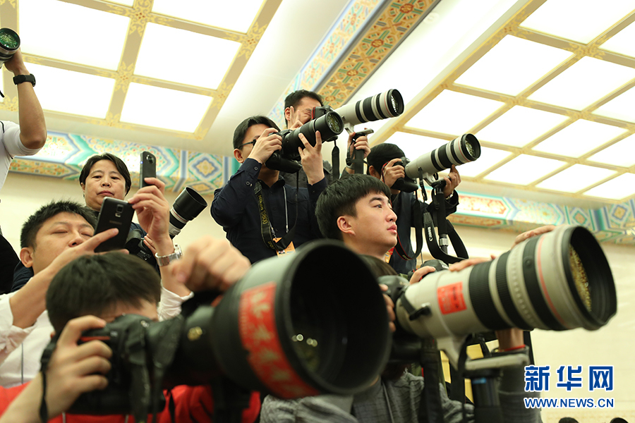 3月15日上午,國務院總理李克強在人民大會堂三樓金色大廳會見采訪十二屆全國人大五次會議的中外記者并回答記者提出的問題。圖為記者在現場拍攝。新華網/中國政府網 翟子赫 攝?