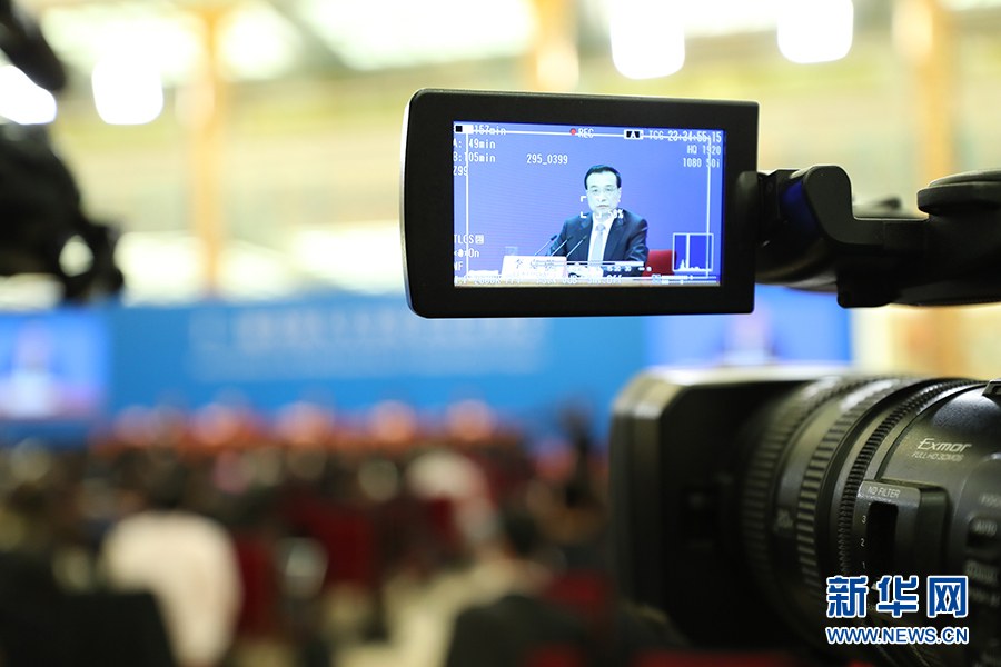 3月15日上午,國務院總理李克強在人民大會堂三樓金色大廳會見采訪十二屆全國人大五次會議的中外記者并回答記者提出的問題。圖為記者會現場。新華網/中國政府網 翟子赫 攝?
