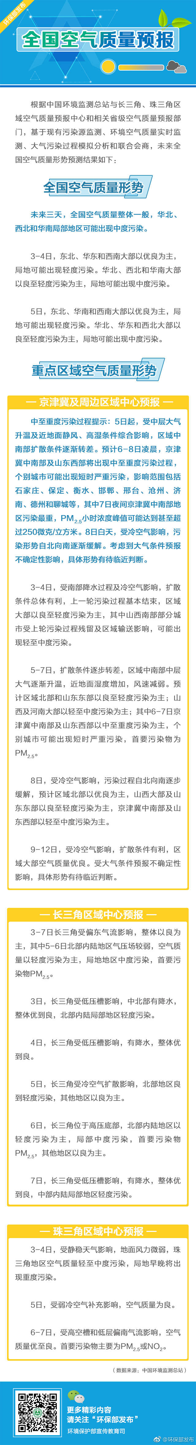 據環境保護部宣傳教育司官方微博消息,未來三天(1月3日-5日),全國空氣質量整體一般,華北、西北和華南局部地區可能出現中度污染。5日起,京津冀及周邊區域中南部擴散條件逐漸轉差。預計6-8日凌晨,京津冀中南部及山東西部將出現中至重度污染過程,個別城市可能出現短時嚴重污染,其中7日夜間中南部地區污染最重。8日白天,受冷空氣影響,污染形勢自北向南逐漸緩解。