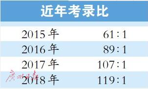 記者查詢近年廣州市公務員考試的數據發現,近幾年競爭越發激烈,2015年計劃招錄738人,44825人成功通過審核并繳費,61∶1的平均考錄競爭比已經高出歷史平均水平。2016年,廣州市公務員考試計劃招錄1090人,成功報名人數為97182人,平均考錄競爭比約為89∶1。到了2017年,廣州市公務員考試分為廣州和北京“雙考區”進行,計劃招錄924人,成功報名人數為99038人,平均考錄競爭比約為107∶1,競爭激烈程度超越往年。2018年廣州市公務員考試恢復單考區,共設592個職位,計劃招錄722人,比起去年大幅減少,但有85770人成功報名,平均考錄競爭比達到119∶1,幾乎是2015年61∶1考錄競爭比的兩倍。