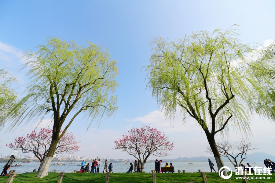 3月26日,雨后西湖再度晴歸。西湖白堤,正是桃紅柳綠時。(浙江在線拍友 里爾 攝)