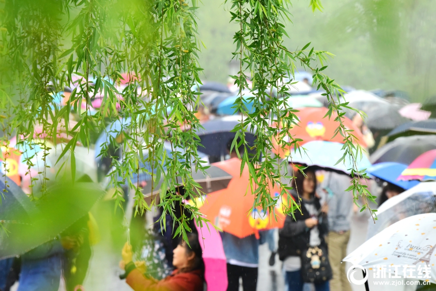 4月5日,清明小長假首日,杭州細雨綿綿,西湖景區游客絡繹不絕。杭城雖降雨降溫,但西湖景區前來賞花踏青的游客如潮,斷橋似人橋。(浙江在線拍友 里爾 柱子 攝)