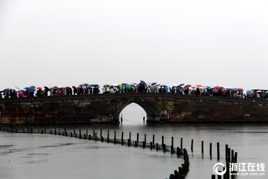 4月5日,清明小長假首日,杭州細雨綿綿,西湖景區游客絡繹不絕。杭城雖降雨降溫,但西湖景區前來賞花踏青的游客如潮,斷橋似人橋。(浙江在線拍友 里爾 柱子 攝)
