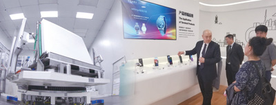 圖左為維信諾(固安)第六代全柔AMOLED生產(chǎn)線智能車間,圖右為維信諾總裁張德強(qiáng)博士(左一)介紹柔性屏產(chǎn)品終端應(yīng)用。資料圖片 制圖:張丹峰