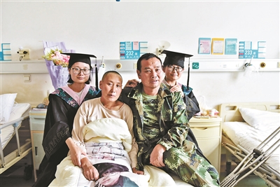 5月27日下午,昆明醫(yī)科大學第一附屬醫(yī)院1號住院樓的神經外科,走進一群穿著學士服的女學生。她們是云南民族大學財務管理專業(yè)的畢業(yè)生,因為室友李夢楠的母親周玉梅重病住院,李夢楠可能無緣班級畢業(yè)照,室友們決定在病房里幫李夢楠完成拍攝畢業(yè)照的愿望。也是在這一天,李夢楠和家人拍下了第一張全家福。