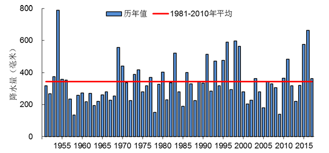 周兵:2018年華南前汛期于4月20日首先在廣西開始,較常年(4月6日)偏晚14天,近60年廣西首先開汛的年份只有5年:1963、1971、1990、1996和2018。3月到5月,華南地區的平均降水量較常年同期偏少36.9%,導致當地出現不同程度的氣象干旱。而6月初,4號臺風“艾云尼”3次登陸廣東,帶來了充沛的龍舟水,一定程度上緩解了旱情。