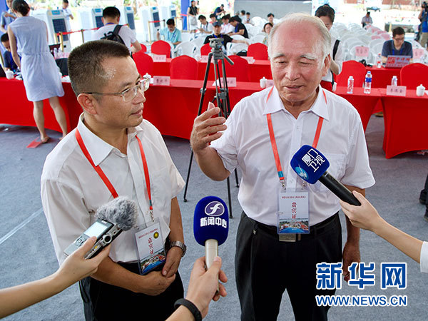 8月5日,在福建晉江舉行的福建向金門供水工程通水現場會上,來自金門的王再生老人(右)和福建省水投集團公司副總經理朱金良(左)接受采訪。 新華社記者 姜克紅 攝