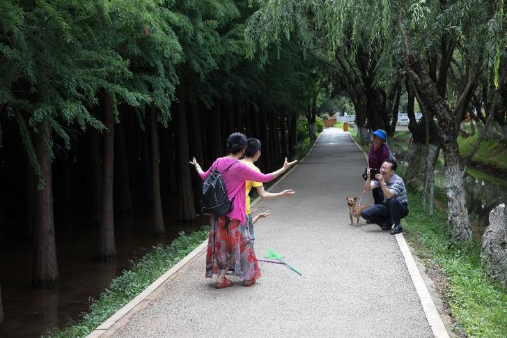 7月21日,游客在滇池東岸撈魚河濕地公園留影。 云南省昆明市撈魚河濕地公園位于滇池東岸。近年來,通過當(dāng)?shù)卣母脑旌椭卫恚瑩启~河濕地公園整體環(huán)境得到明顯改善。 新華社記者 金立旺 攝