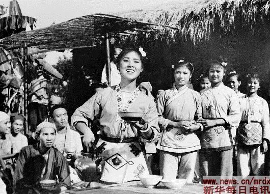影片《劉三姐》中的一個(gè)鏡頭:劉三姐(前,黃婉秋飾)和四方歌手會(huì)歌。新華社資料片
