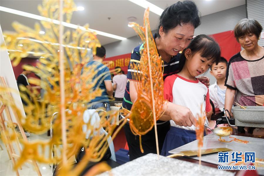 非遺傳承人張?jiān)破迹ㄗ螅┰诮绦∨笥堰M(jìn)行糖畫創(chuàng)作