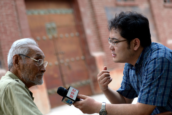 圖為2015年7月,陳晨(右)在陜西省涇陽縣采訪抗戰老兵寧西珍。