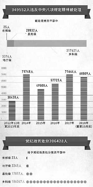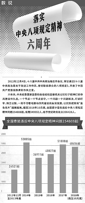 六年來,中央紀委國家監委和各級紀檢監察機關以釘釘子精神打好作風建設持久戰,一個節點一個節點堅守,一個問題一個問題解決,盯緊盯牢、持之以恒,一刻不停歇地推動作風建設向縱深發展,以實際成效將“金色名片”越擦越亮。截至2018年10月底,全國累計查處違反中央八項規定精神問題254808起,處理349552人,給予黨紀政務處分206428人。