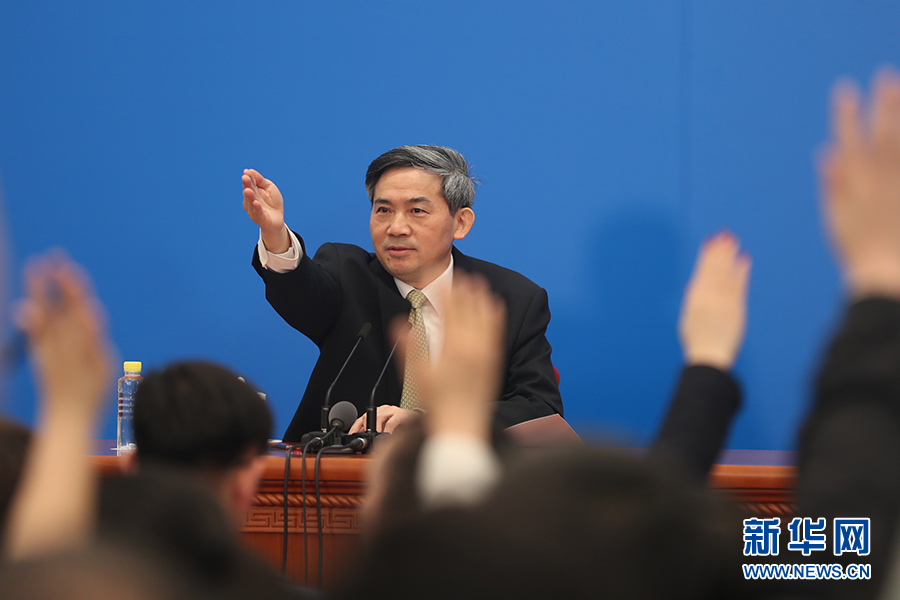 3月4日,十三屆全國人大一次會議在人民大會堂新聞發(fā)布廳舉行新聞發(fā)布會,由大會發(fā)言人張業(yè)遂就大會議程和人大工作相關的問題回答中外記者的提問。圖為新聞發(fā)布會主持人何紹仁。新華網(wǎng)/中國政府網(wǎng) 陳杰 攝