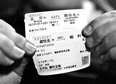 秘京春告訴北京青年報記者,6451次最初是給鐵路職工上下班的通勤車,使用最簡易的車廂,鐵路職工免費乘坐,同時面向社會開放,由于票價低廉,非常貼近普通百姓。但隨著時代發展,很多老綠皮車線路停運。為留作紀念,秘京春購買了6451/6452次最后一趟的全程車票,單程票價6.5元。但他并不打算坐滿全程,而是到廊坊北下車,再轉乘別的列車返京,用他的話說是“買長坐短”。