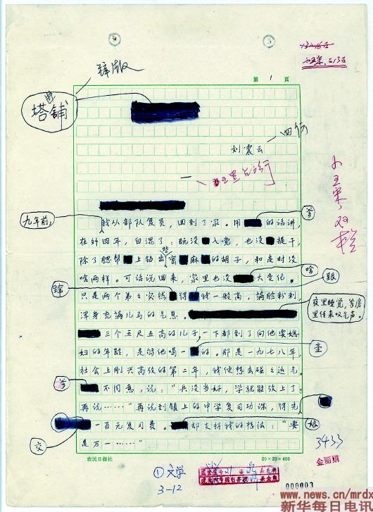 此次展出的手稿,還有手寫于農(nóng)民日?qǐng)?bào)社稿紙的劉震云小說(shuō)《塔鋪》。與莫言《透明的紅蘿卜》類似的,這篇“新寫實(shí)小說(shuō)”代表作的篇名也是修改過(guò)的,原名叫“河堤”,后來(lái)才改為“塔鋪”。盡管是謄清的手稿,其中仍充滿大量細(xì)微的刪減與成塊的涂抹。“不小心”改為“無(wú)意間”,“聚在”改為“聚到”,連“地”“的”“還”“又”等字眼也在斟酌后刪去,體現(xiàn)了作者對(duì)凝練精準(zhǔn)、不冗不贅的語(yǔ)言風(fēng)格的極致追求。