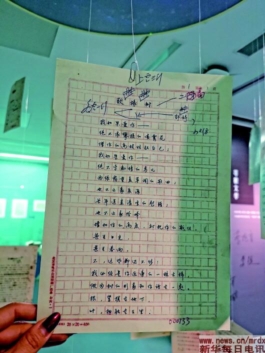 舒婷的詩(shī)歌代表作《致橡樹(shù)》就寫在42年前的兩頁(yè)“北京市電車公司印刷廠”印制的紅色格子稿紙上。如今它被串上線,懸掛在中國(guó)現(xiàn)代文學(xué)館的展廳中央。