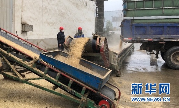 圖為安徽省鳳陽(yáng)縣鳳臨糧貿(mào)有限公司卸糧現(xiàn)場(chǎng)。新華網(wǎng)汪亞/攝