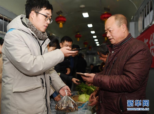 1月24日,乘客使用手機支付購買周興安(右)自產的香菇產品。新華社記者 張博文 攝