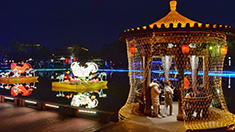 以貢水河為舞臺,宣恩燈展在擺放布局上匠心獨運。在主城區的自然河道上,分別展示包含宣恩元素及生肖屬相的大型燈組,通過靜止的河面倒映燈影,璀璨的燈影同時又點亮河,河與燈交相輝映,讓這座小城更顯風韻十足。同時,為了與河中燈組呼應,在陸地的廣場中、花壇里、人行道旁樹上也排列著生肖賀歲系列的燈組,拉伸了觀賞區域。