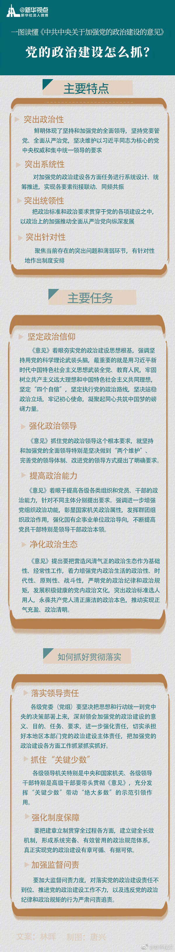 黨的政治建設是黨的根本性建設,決定黨的建設方向和效果。新華社27日受權發布《中共中央關于加強黨的政治建設的意見》。意見有什么特點?加強黨的政治建設有哪些主要任務?如何抓好落實?戳圖了解↓ ????