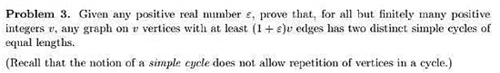 讓中國隊全軍覆沒的第3題,翻譯過來的大致意思是:給定任何一個正實數e,證明除了有限個正整數以外的所有正整數v,任何有v個頂點并且有大于等于 (1+e)v條邊的圖至少包含兩個不同的等長簡單回路。