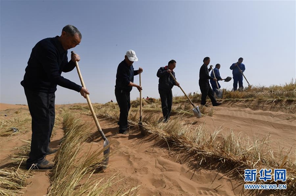 在甘肅省古浪縣境內的黑崗沙風沙口,八步沙第二代治沙人用稻草壓沙(3月26日攝)。新華社記者 范培珅 攝