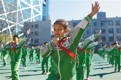 新京報記者走訪北京中小學發現,動感活潑的音樂和流行的動作更能激發同學的鍛煉熱情,尤其是那些跳慣了傳統廣播體操的高年級學生。為此,北京一些學校通過自編操提升學生興趣,武術、跳繩等動作和流行音樂也融入了課間操中。