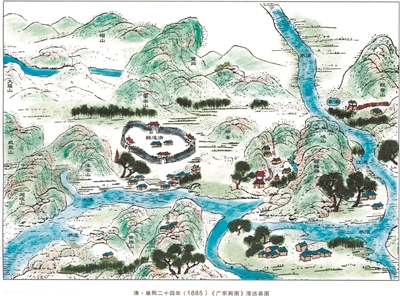 清代康熙年間的清遠(yuǎn)地圖, 用中國山水畫中的散點透視的技法繪制。