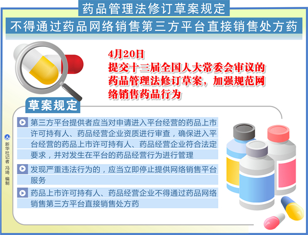 新華社北京4月20日電(記者趙文君)20日提交十三屆全國(guó)人大常委會(huì)審議的藥品管理法修訂草案,加強(qiáng)規(guī)范網(wǎng)絡(luò)銷售藥品行為,明確不得通過藥品網(wǎng)絡(luò)銷售第三方平臺(tái)直接銷售處方藥。