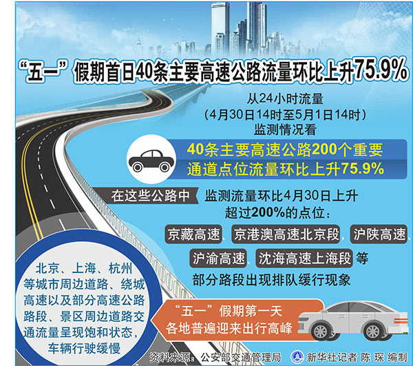 圖表:“五一”假期首日40條主要高速公路流量環比上升75.9% 新華社記者 陳琛 編制