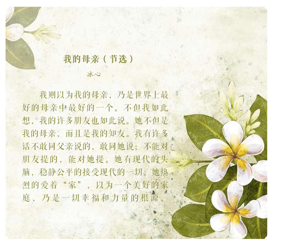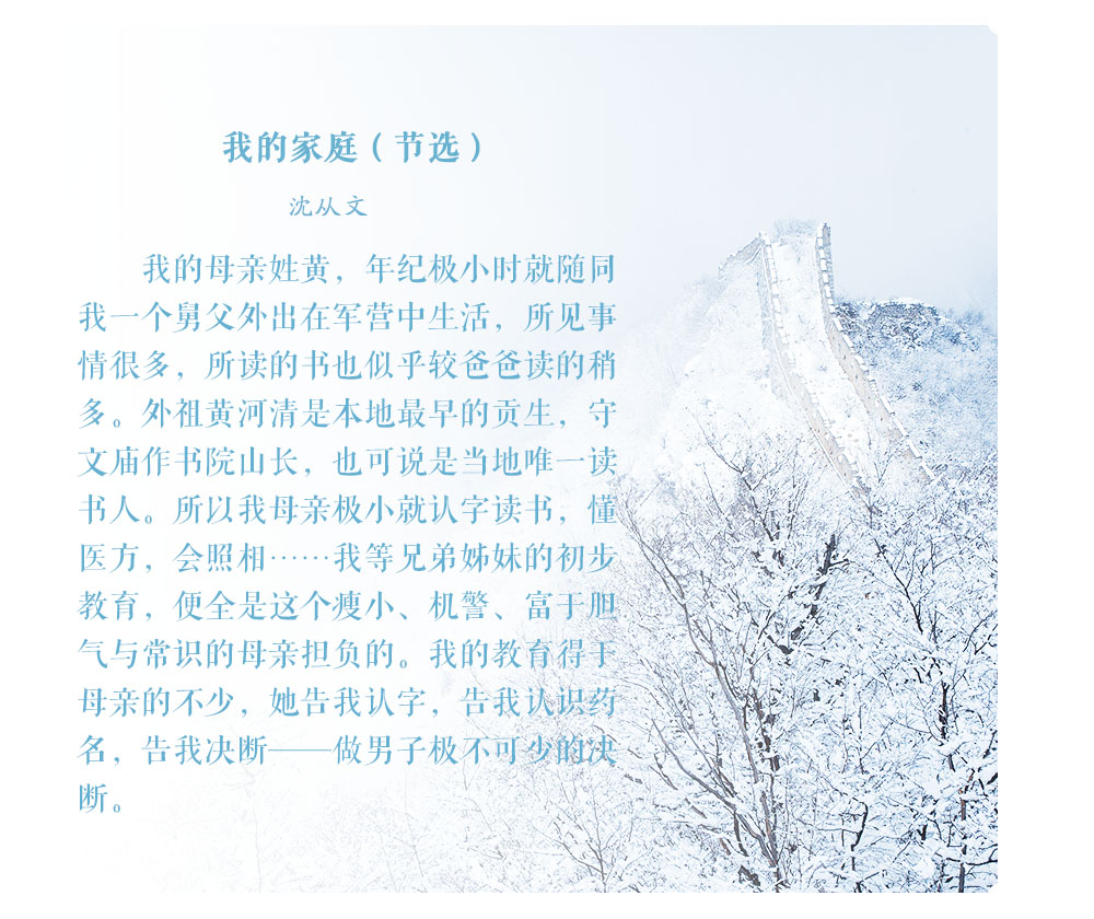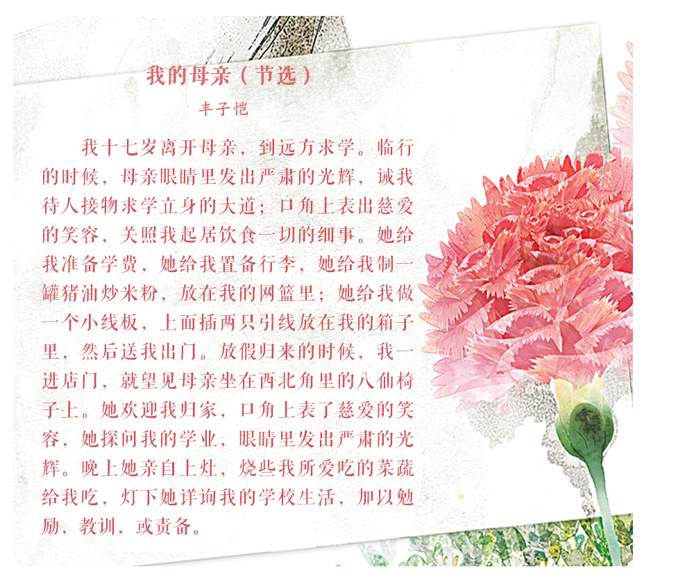 人們常說“嚴父慈母”,父愛總是如山般深厚內斂,而母愛則如水般細膩溫柔?!芭R行密密縫,意恐遲遲歸”,母親從不用華麗的辭藻訴說她們的愛,而是默默將其融入生活的一點一滴;“月明聞杜宇,南北總關心”,一切遠行的出發點總是與母親告別,但兒行千里母擔憂,我們從未離開過母親的牽掛——孩子走到哪里,母親的心就跟到哪里。然而母親的偉大,不僅在于她給予我們生命和愛,更因她讓我們從頑愚走向睿智,教會我們應以怎樣的方式立身于天地之間。讓我們一起走進老舍、沈從文等名家的回憶中,回望他們身后慈祥的母親,感受動人的母愛。