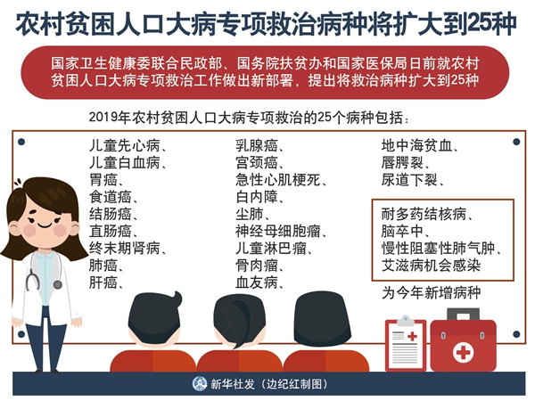 新華社北京5月14日電(記者屈婷)國家衛生健康委聯合民政部、國務院扶貧辦和國家醫保局日前就農村貧困人口大病專項救治工作做出新部署,提出將救治病種擴大到25種。