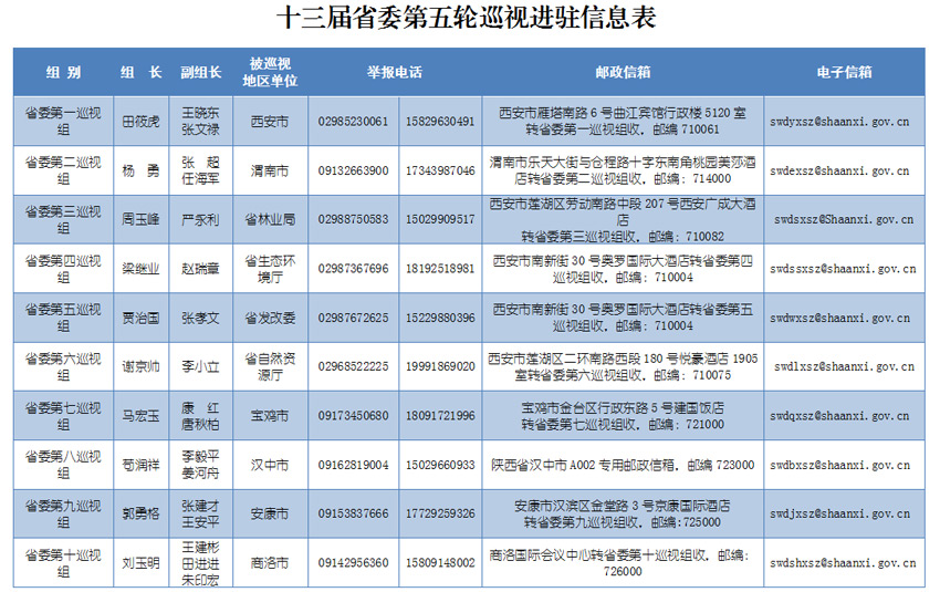 根據安排,省委巡視組將在被巡視地區、單位工作1個月左右。巡視期間設值班電話、郵政信箱、電子郵箱等,巡視組受理信訪時間截止到2019年6月30日。省紀委監委信訪舉報受理電話(029—12388)、信箱(西安市雁塔區雁塔路南段十號陜西省紀委監委信訪室)和網上舉報窗口(http://shaanxi.12388.gov.cn),同步受理涉及秦嶺生態環境保護的信訪舉報。根據秦嶺生態環境保護專項巡視工作要求,省委巡視組主要受理反映被巡視地區和單位秦嶺生態環境保護方面的問題和線索。對不屬于這次專項巡視受理范圍的信訪問題反映,將按規定轉交被巡視地區或單位和有關部門認真處理。