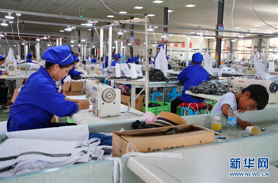 8月29日,在甘肅省臨夏回族自治州東鄉(xiāng)族自治縣達(dá)板鎮(zhèn)一扶貧車間,一名工人在車間制作衣服,她的兒子在一旁陪伴。 新華社記者 陳君清 攝