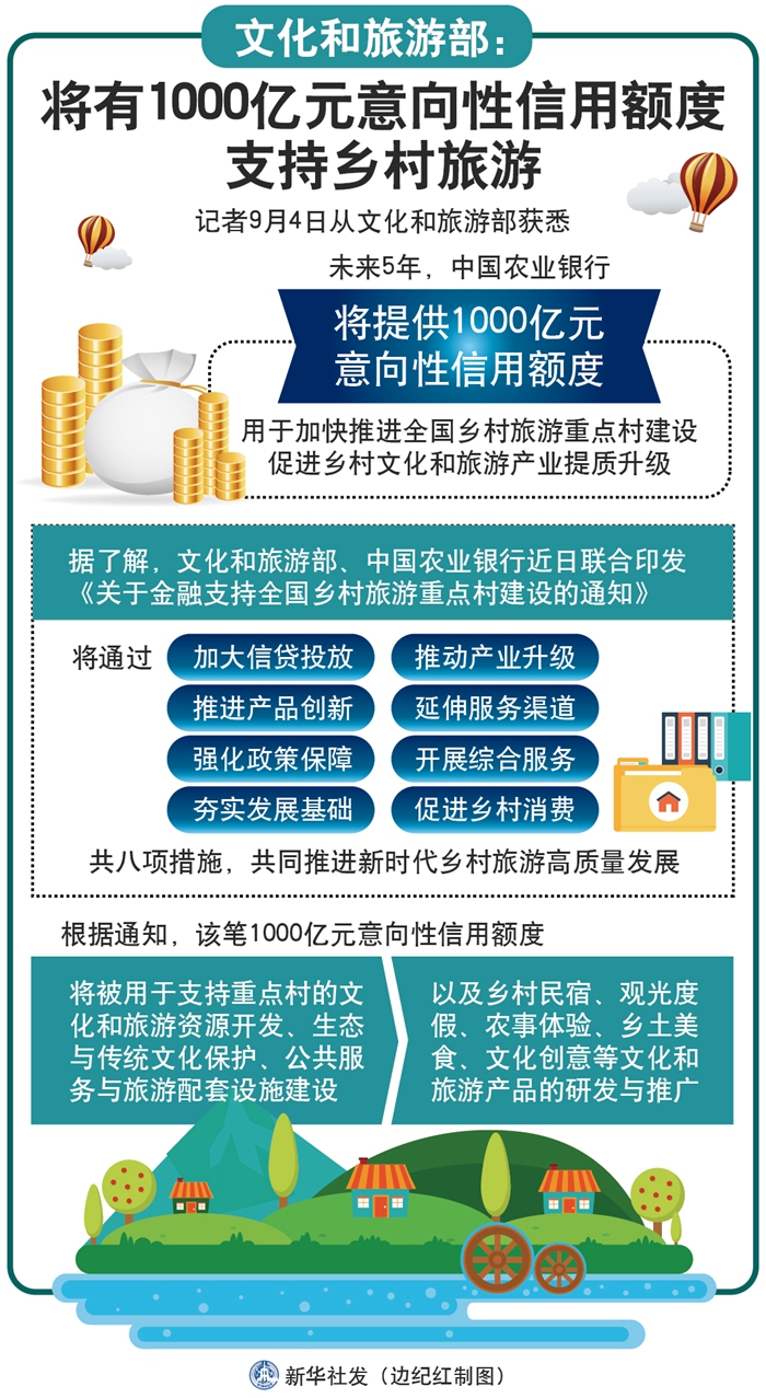 新華社北京9月4日電(記者余俊杰)記者4日從文化和旅游部獲悉,未來5年,中國農業(yè)銀行將提供1000億元意向性信用額度,用于加快推進全國鄉(xiāng)村旅游重點村建設,促進鄉(xiāng)村文化和旅游產業(yè)提質升級。
