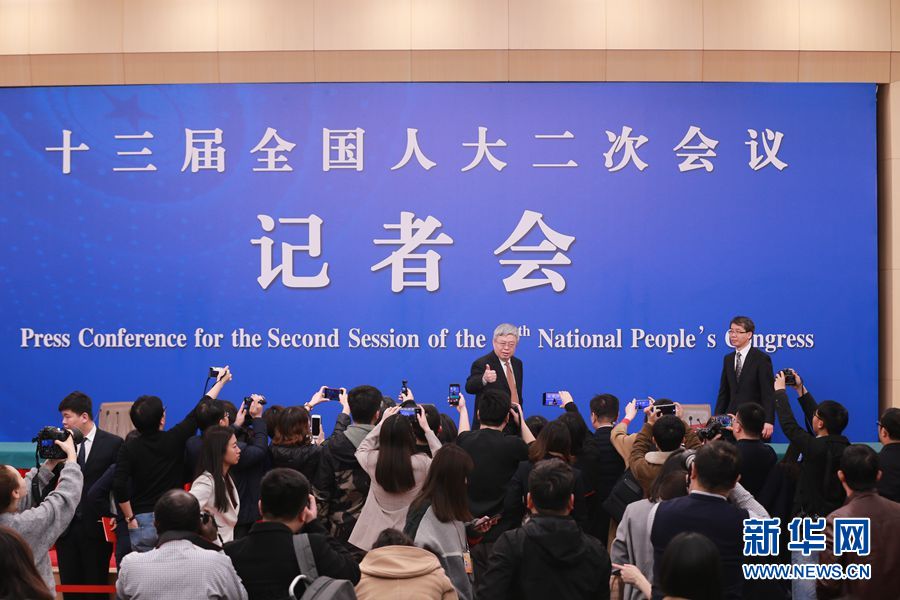 十三屆全國人大二次會議新聞中心于3月7日10時50分在梅地亞中心新聞發布廳舉行記者會,邀請國務院扶貧開發領導小組辦公室主任劉永富就“攻堅克難——堅決打贏脫貧攻堅戰”相關問題回答中外記者提問。圖為記者會結束后劉永富與記者們交流。新華網?劉廈 攝